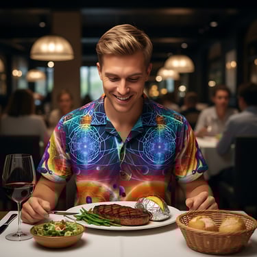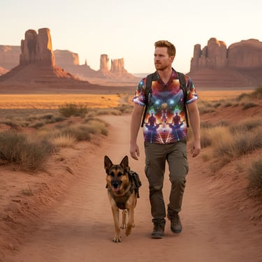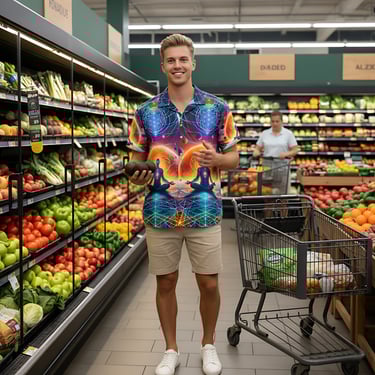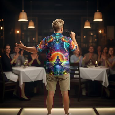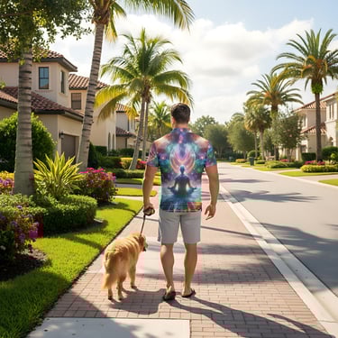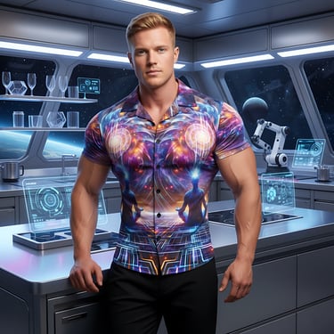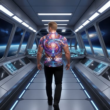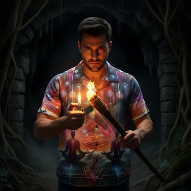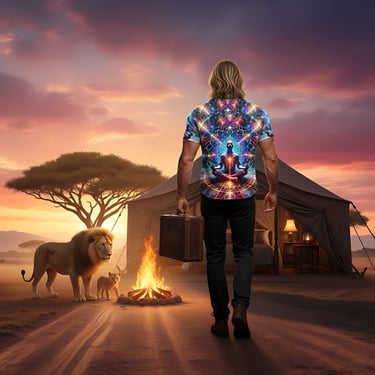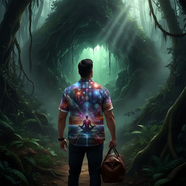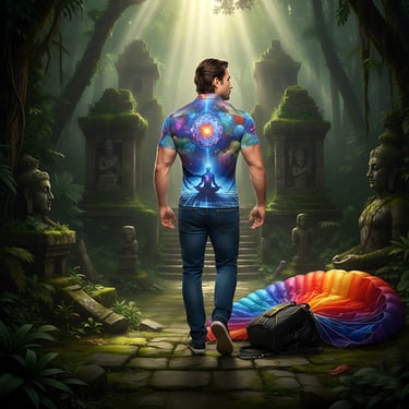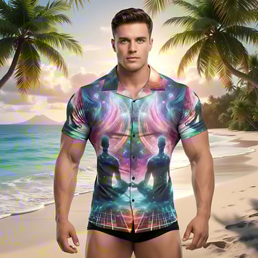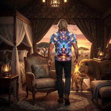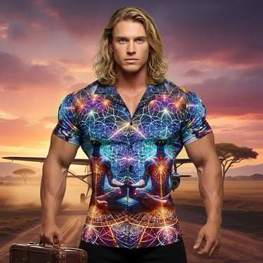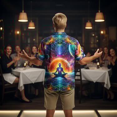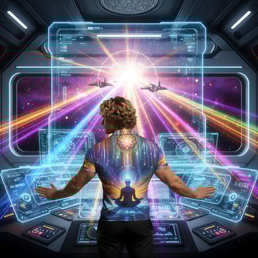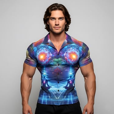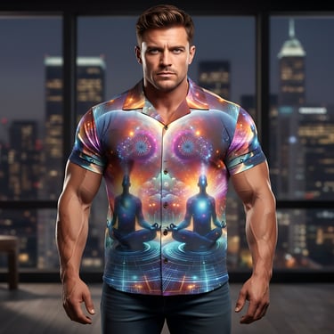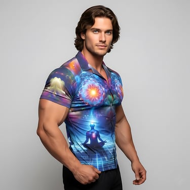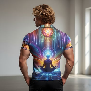 This design presents a breathtaking fusion of sacred geometry, light, and human consciousness. The composition evokes transcendence, enlightenment, and the harmony between human energy and the divine geometry of the universe.