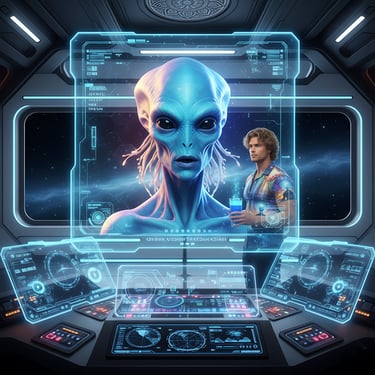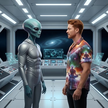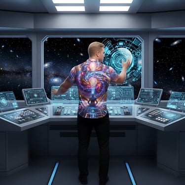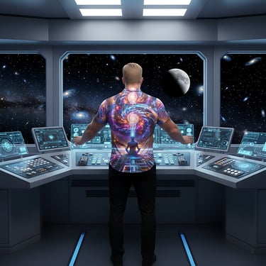 The image portrays a surreal, cosmic scene blending human consciousness with digital and celestial realms. The overall atmosphere conveys transcendence, enlightenment, and the merging of technology, spirituality, and the infinite universe.
