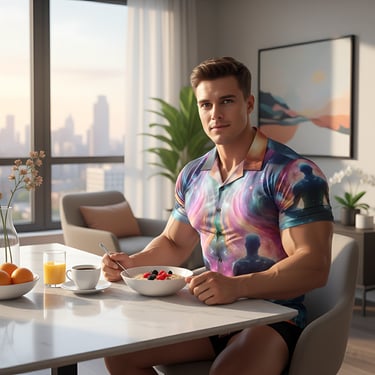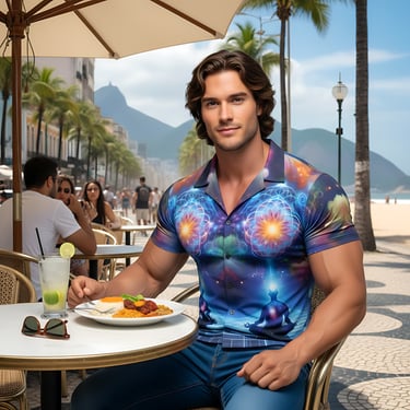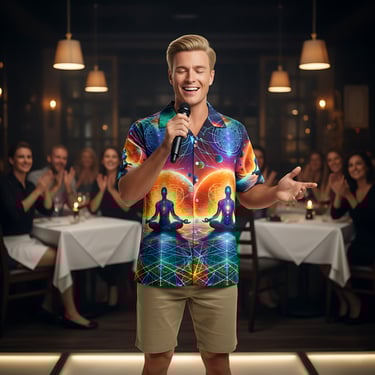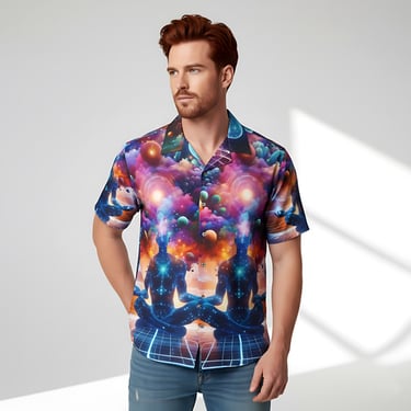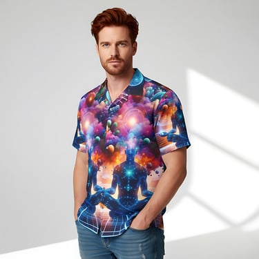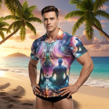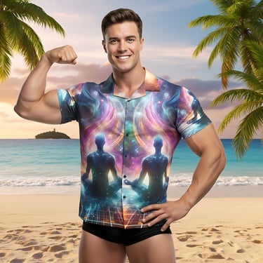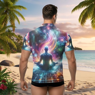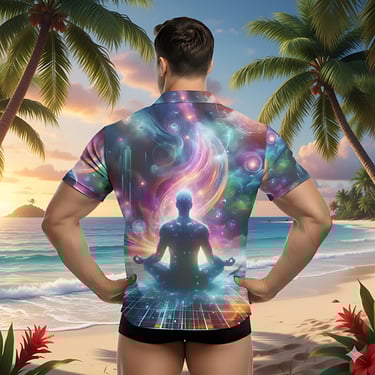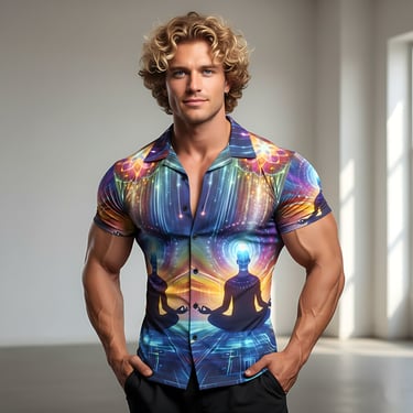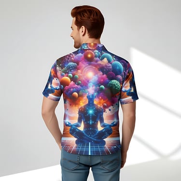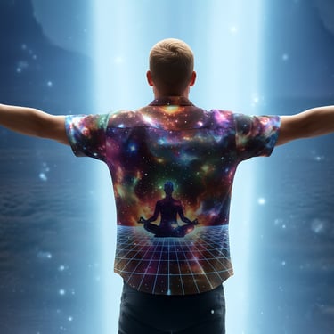 A breathtaking fusion of cosmic wonder and inner peace, this luminous human figure sits in deep meditation, radiating with vibrant, starlit energy. The scene symbolizes cosmic consciousness, and the harmony between spirit and the boundless expanse of creation.