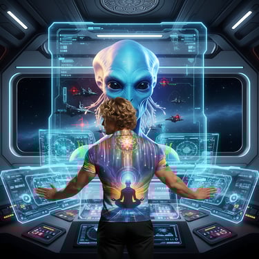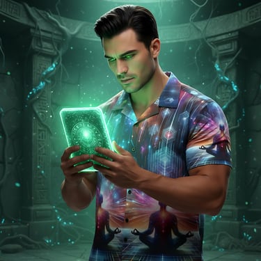 A meditative human silhouette sitting cross-legged on a glowing digital grid, radiating calm and blending technology and mysticism. The scene symbolizes spiritual awakening, higher consciousness, and the fusion of human energy with cosmic and digital realms.