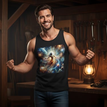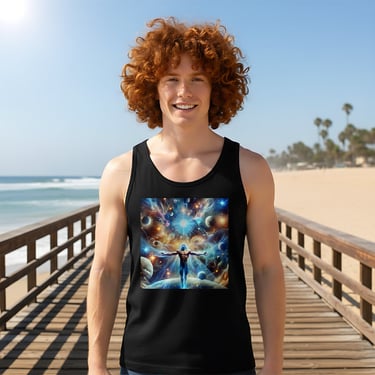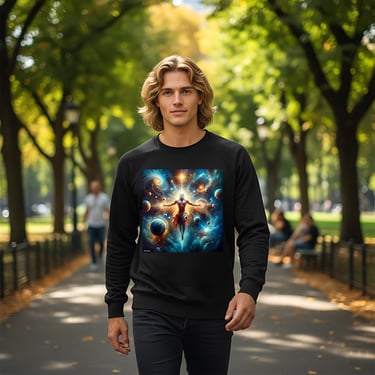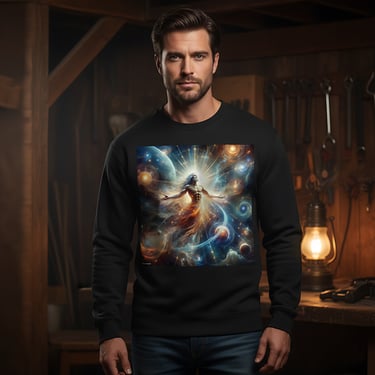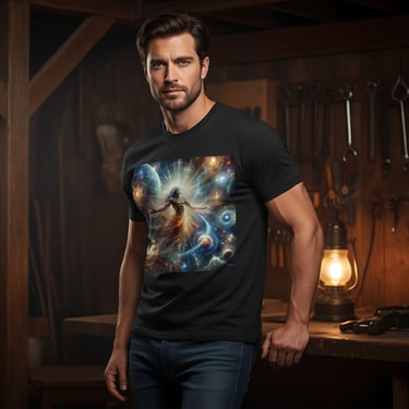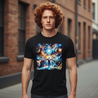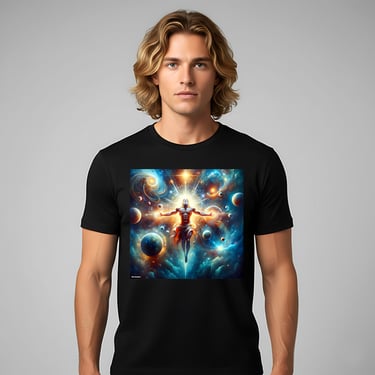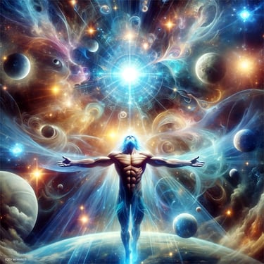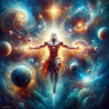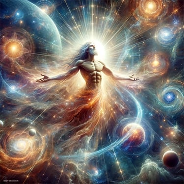 A luminous celestial being stands with arms open, radiating light and energy as galaxies swirl around him in a cosmic dance. His form merges with the universe itself, symbolizing divine creation, enlightenment, and the boundless power of cosmic unity.