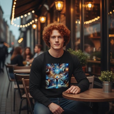 A powerful cosmic figure stands on a planet with arms outstretched, bathed in radiant light as galaxies and swirling energy converge above him. The image evokes divine connection, ascension, and the infinite unity of the universe.