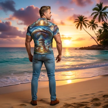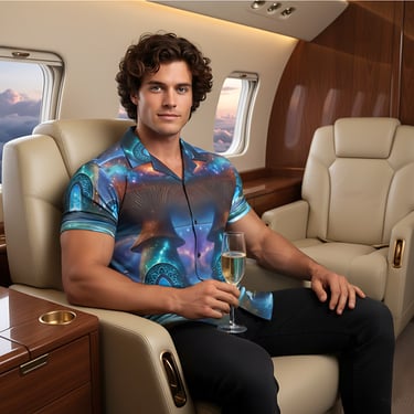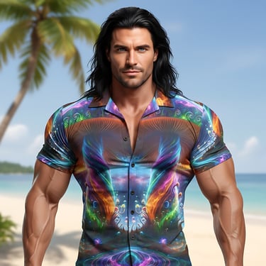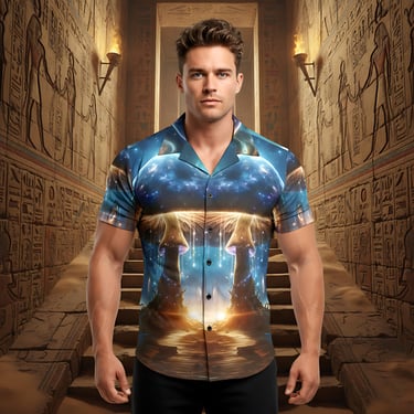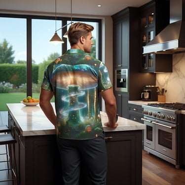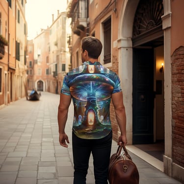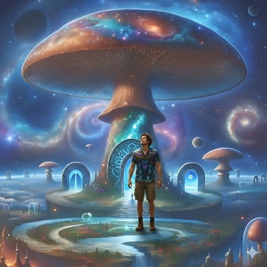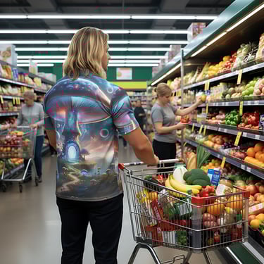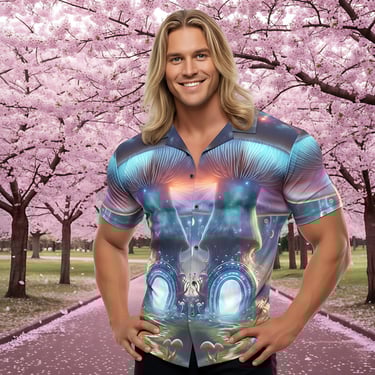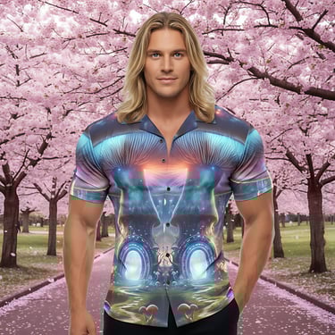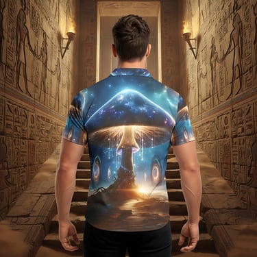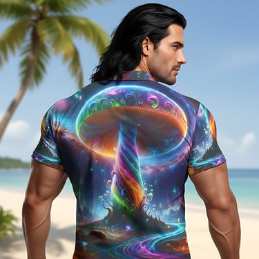 A towering galactic mushroom, its cap adorned with a myriad of cosmic patterns, stands as a gateway between magical earth realms and alternate dimensions. This shirt is a blend of the mystical and the celestial, capturing the essence of the galactic mushroom as a visionary symbol.