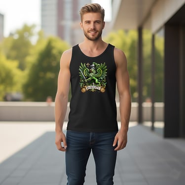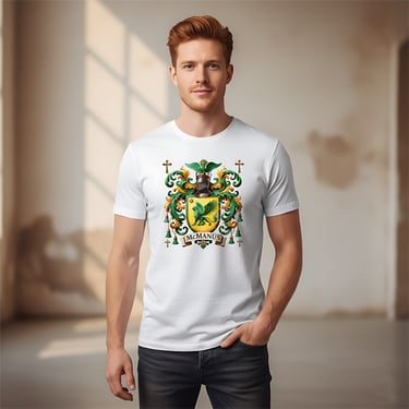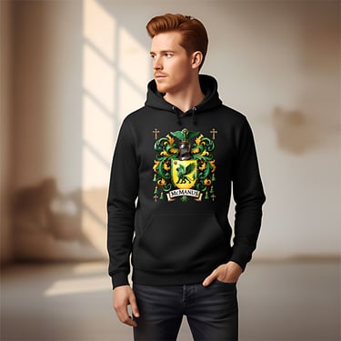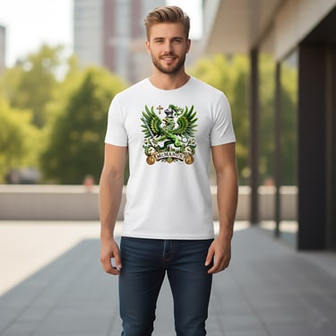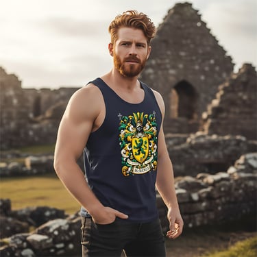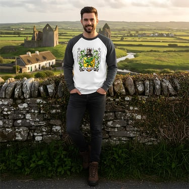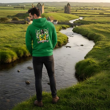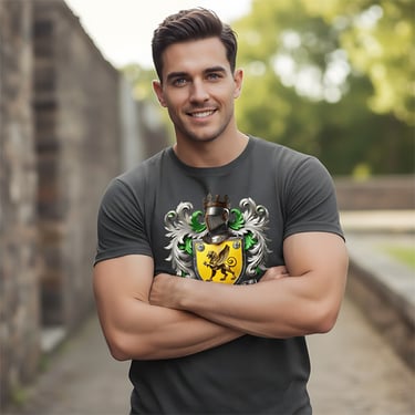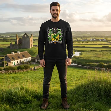 This elegant heraldic design in rich emerald and gold tones, centered around a bold green griffin poised on a golden shield. Surrounded by intricate baroque scrollwork, a knight’s helm, and symbolic crosses, the crest evokes centuries of Celtic nobility, strength, and spiritual heritage.