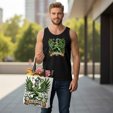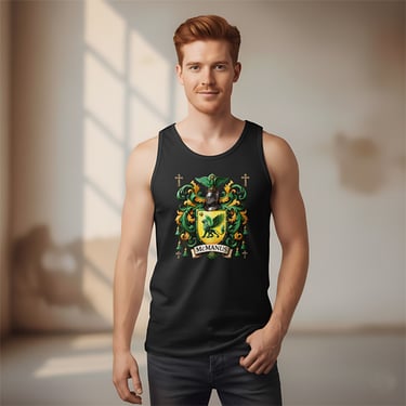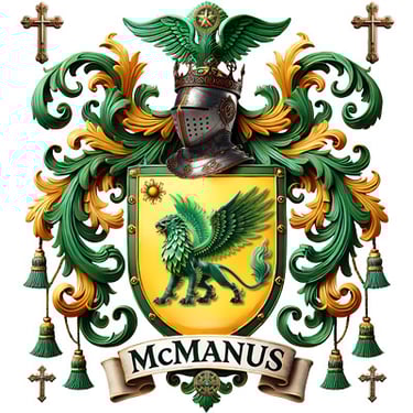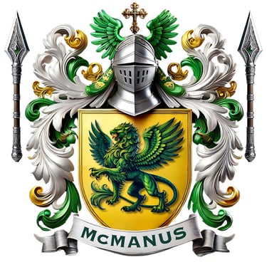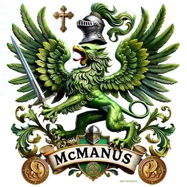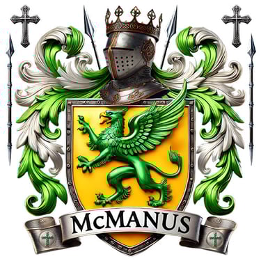 This version of the McManus crest features a powerful green griffin on a radiant gold shield, framed by elegant green-and-silver scrollwork. A crowned knight’s helm and crossed spears complete the design, symbolizing honor, strength, and noble Celtic lineage.