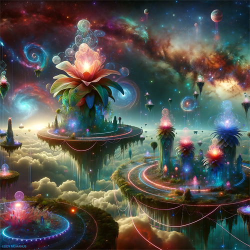 Visions of fantastical gardens in the vastness of the cosmos, with luminous plants and floating islands connected by beams of light. A collection of 10.