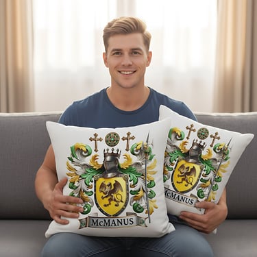 This McManus crest showcases a regal green griffin on a golden shield, flanked by ornate silver and green scrollwork. Topped with a silver knight’s helmet adorned with emerald plumes and a golden cross, and flanked by ceremonial spears, it radiates Celtic nobility, strength, and ancestral pride.