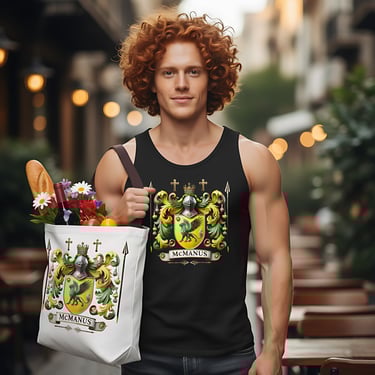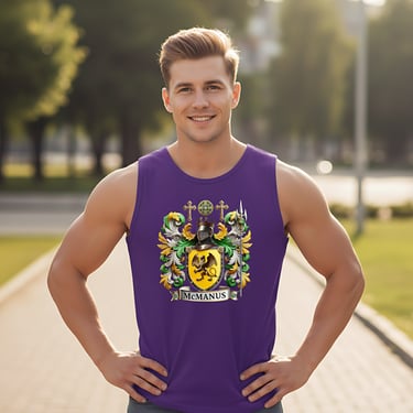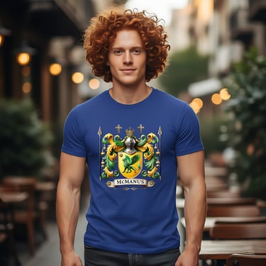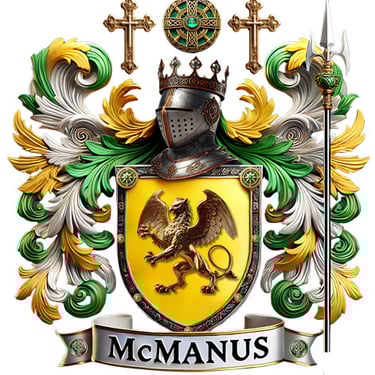 This McManus crest displays a proud bronze griffin on a golden shield, framed by lush green, silver, and gold flourishes. Topped with a crowned knight’s helm and flanked by Celtic crosses and a ceremonial spear, it symbolizes the clan’s noble valor, spiritual heritage, and timeless Celtic royalty.
