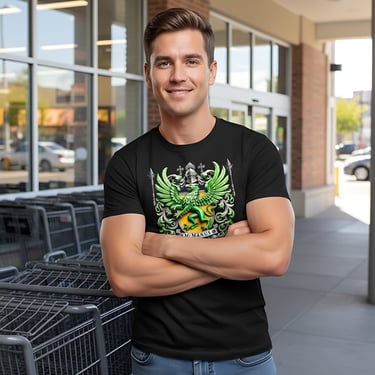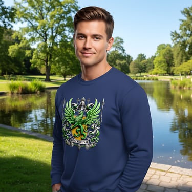 This elegant heraldic design in rich emerald and gold tones, centered around a bold green griffin poised on a golden shield. Surrounded by intricate baroque scrollwork, a knight’s helm, and symbolic crosses, the crest evokes centuries of Celtic nobility, strength, and spiritual heritage.
