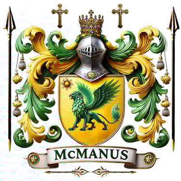 This radiant McManus crest features a majestic green griffin under a golden sun, poised on a brilliant gold shield. Crowned with a jeweled helm and flanked by spears, gold-and-emerald flourishes, and Celtic crosses, it embodies royal legacy, divine light, and proud Celtic heritage.