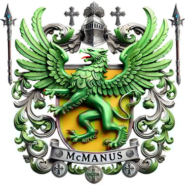 This bold McManus crest features a striking emerald griffin with wings fully outstretched, standing guard over a golden shield. Framed by intricate silver-green scrollwork, crowned spears, and Celtic crosses, it symbolizes unyielding strength, divine protection, and the enduring power of Celtic nobility.